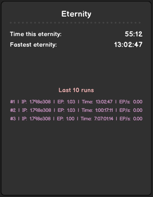Milestone 11 | 100 | x1.05 to IP gain per Eternity (softcapped at 1,000) |