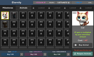 On Eternity 3 you will unlock Zoo and be able to buy your first Animal. Cat is the first available animal and it will multiply IP gain by your eternities. This will significantly improve your future progress.